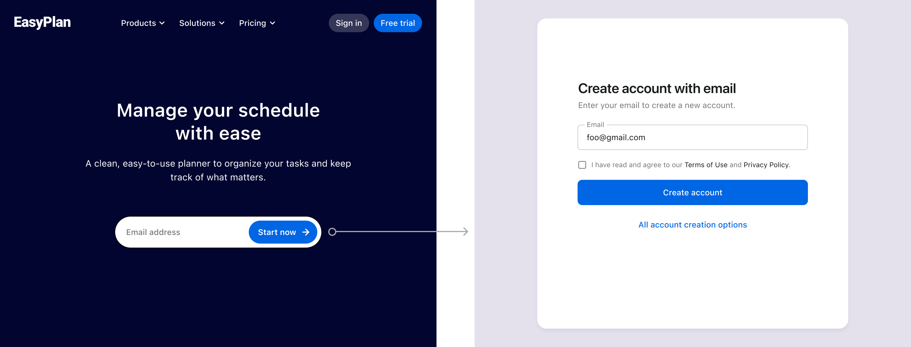 - When users enter their email and click the sign-up button, use the first screen parameter to redirect them to the sign-up page with the email pre-populated.